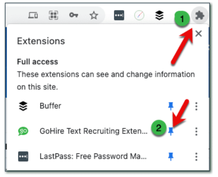 Step 4. Click the Blue Pin, to Pin the Chrome extension on your browser bar, so you can see if notifications of new inbound candidates and text messages.